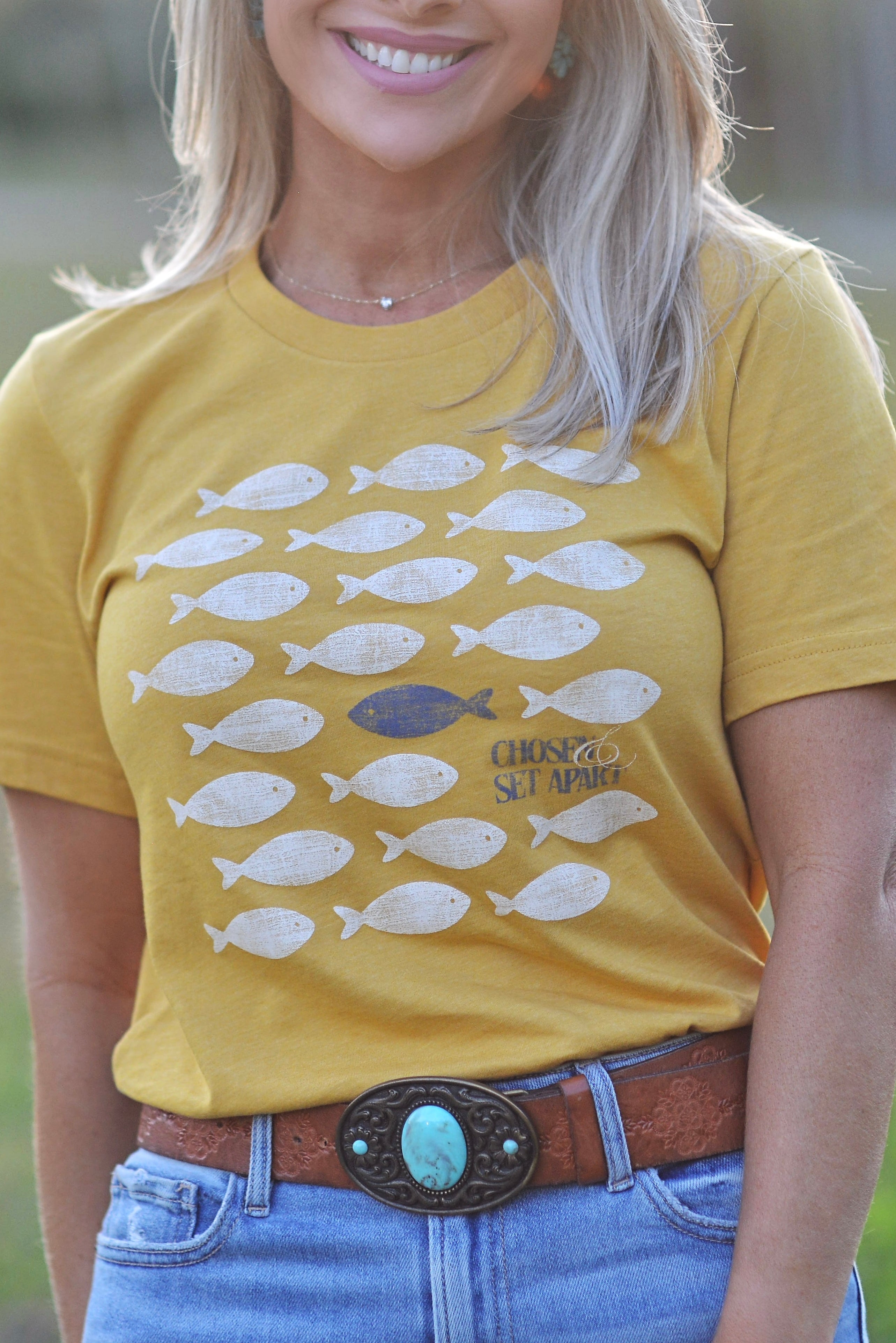 This “Chosen & Set Apart” design is a reminder that following Christ means living with boldness and purpose, even when it sets us apart from the crowd. Inspired by 1 Peter 2:9, it declares the truth that we are chosen by God, called to be His own, and set apart to shine His light in a world that often swims the other way. More than just a shirt, it’s a declaration of faith and a daily encouragement to embrace your identity in Christ with confidence.